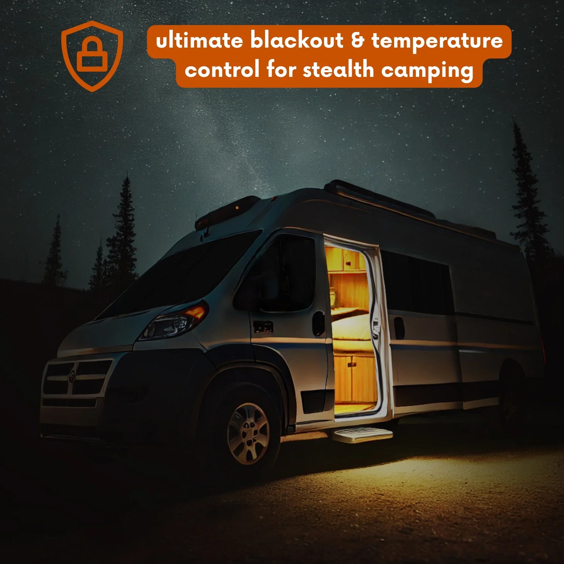 - Temperature Regulation. Crafted with thick, premium insulation, these window covers will keep your van cool in the summer and warm in the winter. They will block out the elements in even the most severe weather conditions.
