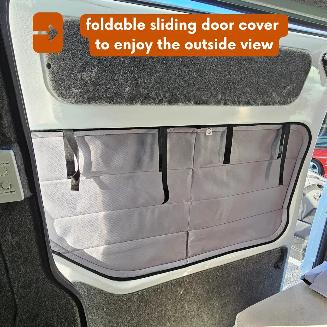 - The sliding door cover is made to fit the window behind the passenger seat.