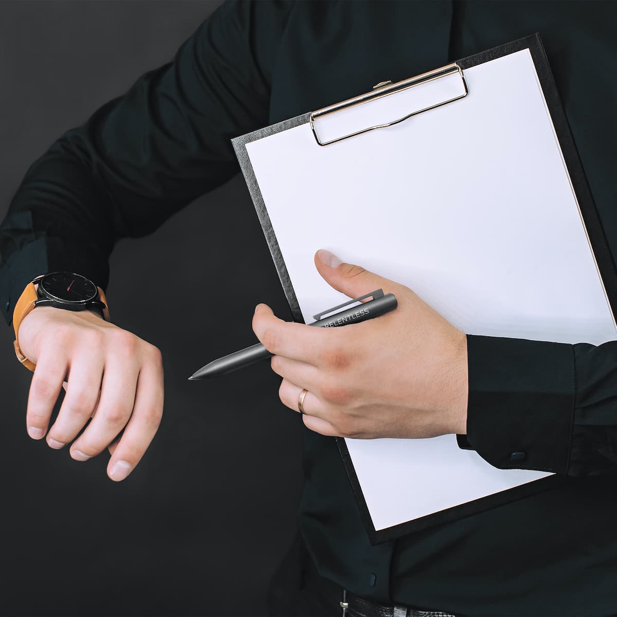 Experience smooth writing and precise strokes with our 1mm medium tip ballpoint pens. Crafted with a weighted metal steel barrel and a comfortable 0.43″ diameter, these cool pens offer a comfortable writing experience. With their sleek and sophisticated design, these expertly crafted black pens add a touch of elegance to any desk decor, making them a perfect addition to men’s gifts.