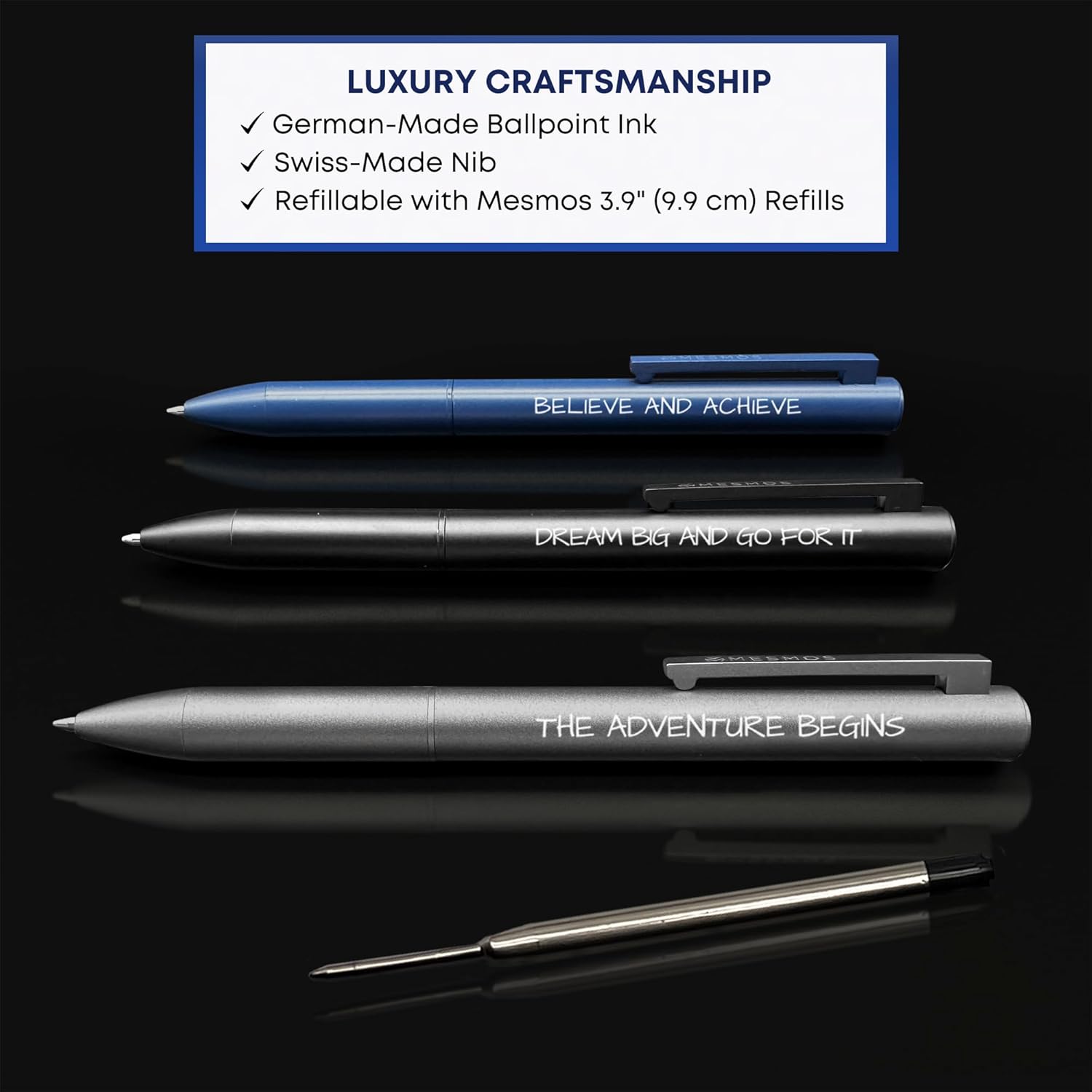 - Inspirational graduation pen set from Mesmos’s Midnight Series, engraved with ‘The Adventure Begins’, ‘Dream Big and Go For It’, and ‘Believe and Achieve’ - a meaningful gift for any graduate.