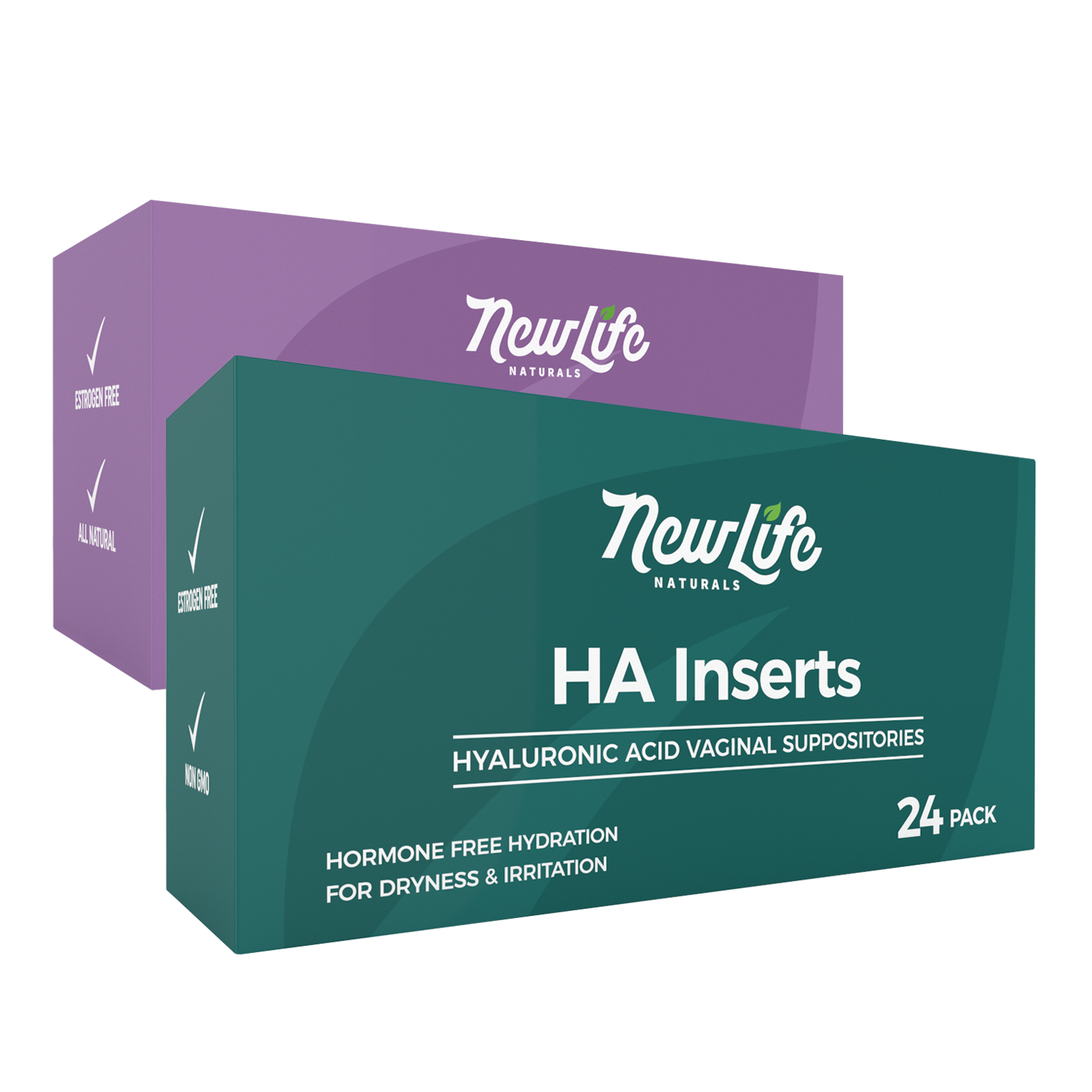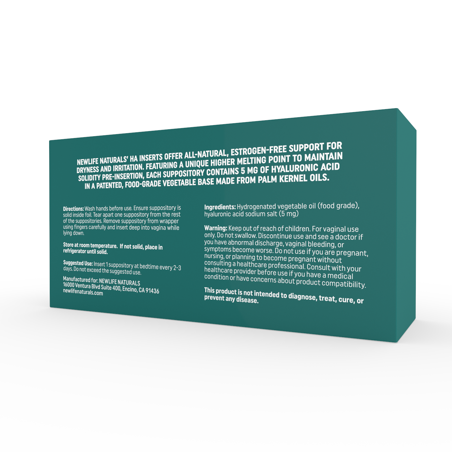 38IU of natural vitamin E (48 count) and 5mg of Hyaluronic Acid (24 count) in an all natural vegetable suppository base, these estrogen free suppositories provides support for vaginal dryness and irritation caused by menopause/post-menopause, from certain medications, etc. Vitamin E can be used daily, but good to alternate with the Hyaluronic Acid suppositories. HA suppositories to be used every two to three days only, and Vitamin E on all other days. This bundle provides a one month + supply.